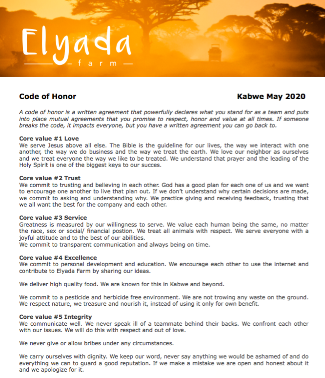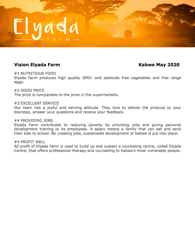Het was mooi om uitgebreid de tijd te nemen om de visie en de waarden van Elyada Farm te bespreken met het team. Sommige punten zijn niet erg Zambiaans, maar wel erg bijbels en daarom belangrijke waarden binnen het bedrijf. Iets om op terug grijpen in momenten van conflict of verwarring.